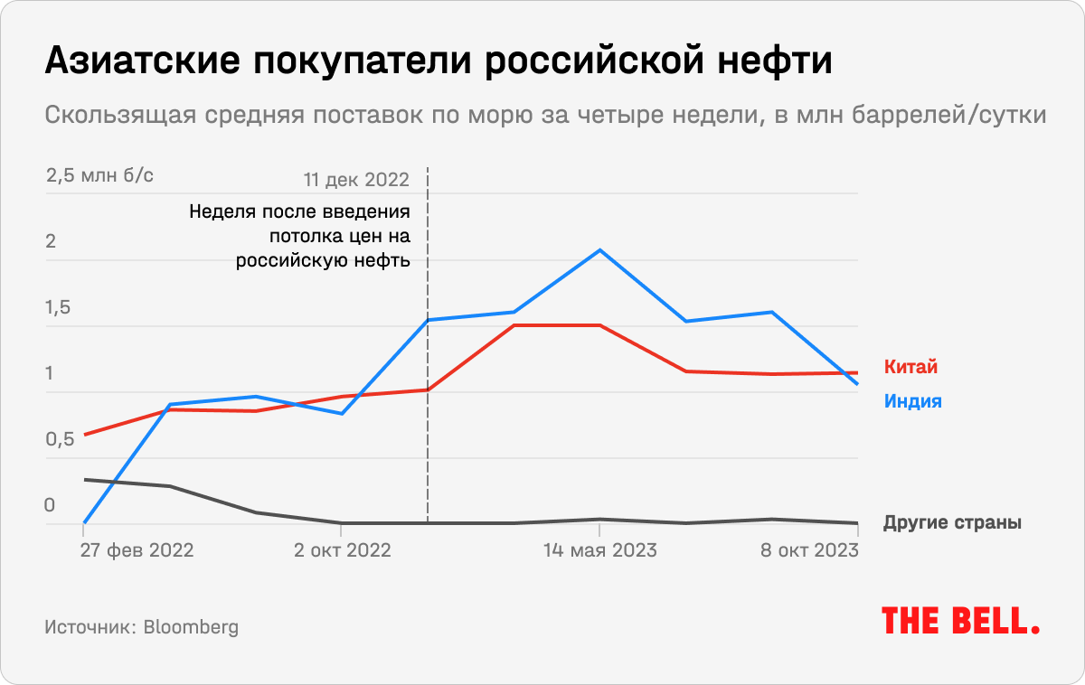 Из-за санкций и потолка цен России пришлось срочно переориентировать нефтяные поставки. Сегодня два главных покупателя российских углеводородов — Индия (первое место) и Китай (второе).