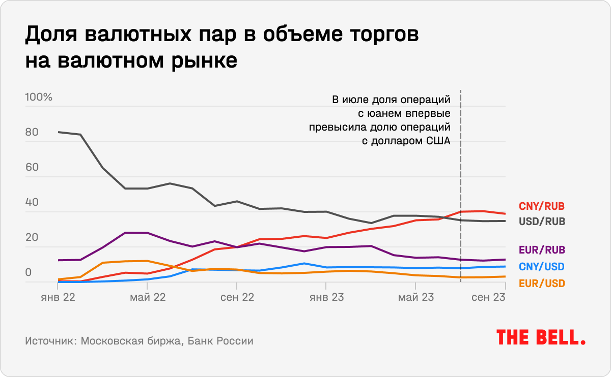 За январь—июль 2023 года объем торгов юанем увеличился в 6,5 раза по сравнению с аналогичным периодом годом ранее. Средний оборот торгов валютной парой рубль/юань с начала 2022 года вырос более чем в 100 раз.
