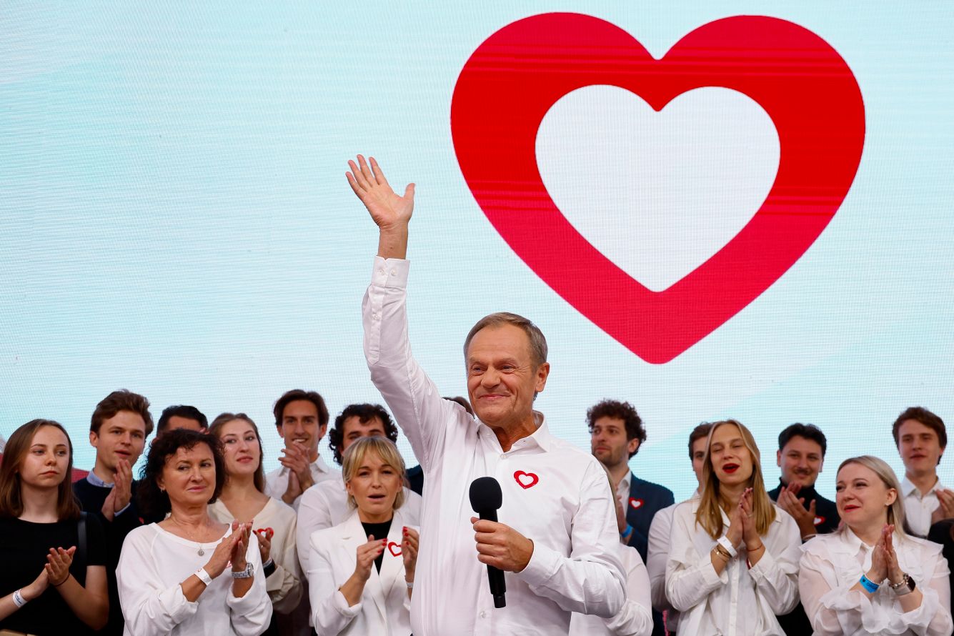 Jacek Szydlowski / Forum / Scanpix / LETA Глава «Гражданской коалиции» Дональд Туск в штабе после оглашения результатов выборов. 15 октября 2023 года