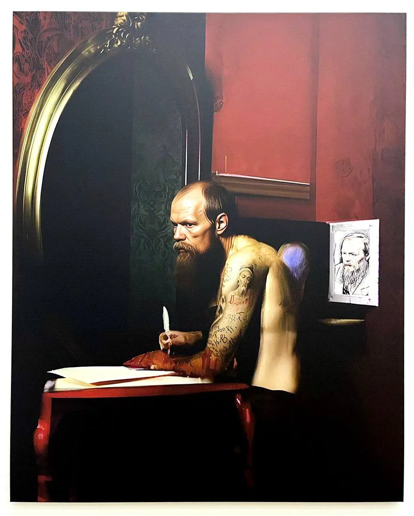 14 октября, во время вечера Сорокина, этикетки на выставке и правда были — распечатанные на бумажках с неровными краями (на мой вопрос кто-то из работающих на выставке ответил, что это дизайн, соответствующий общему стилю). На самой большой бумажке слева от урки-Достоевского было написано: Prompt-engineer EVGENY NIKITIN.