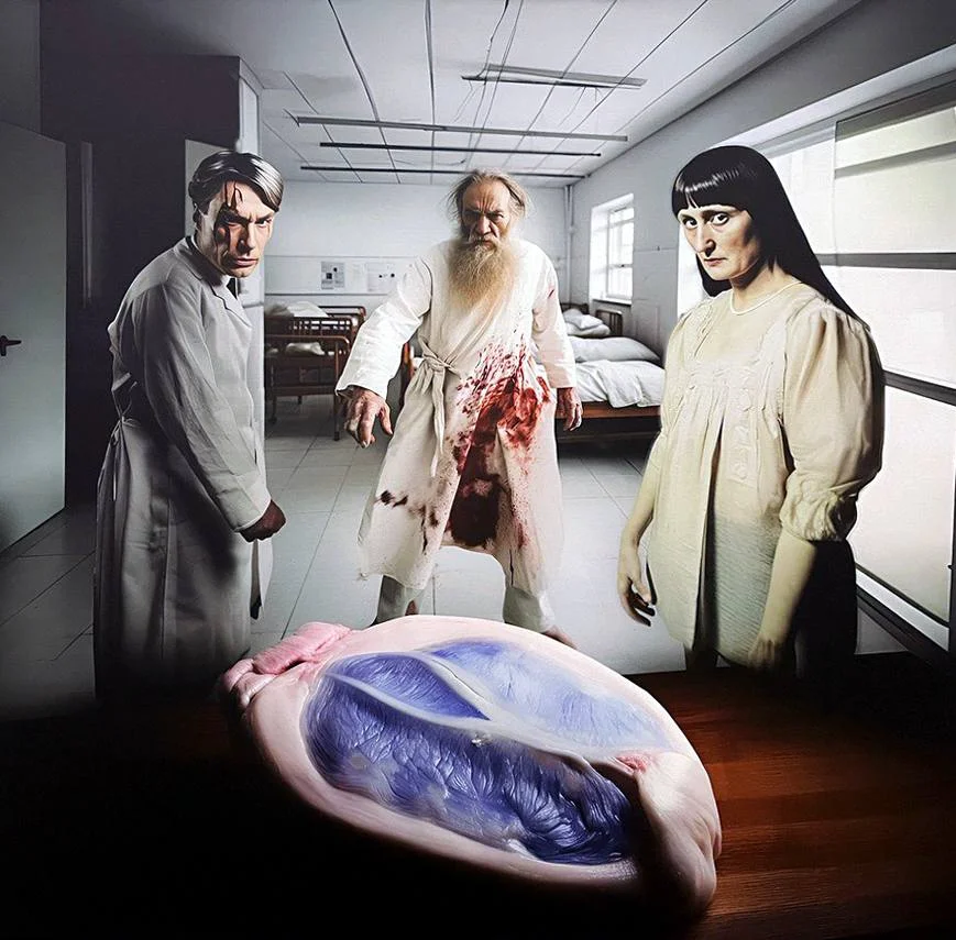 Впрочем, если вглядываться, можно заметить, что у сидящего на больничной койке Толстого слишком длинные ноги, Чехов — слишком низкорослый. То ли оператор не рассказал AI, какого роста были писатели, то ли это специально, дабы подчеркнуть отличия дебиловатых клонов от великих оригиналов. Интерфейс у Artificial Intelligence (а конкретно — у MidJourney) пока слишком сложный, так что между ним и Сорокиным был посредник — поэт и AI-художник Евгений Никитин, согласившийся называться не соавтором, а промпт-инженером.