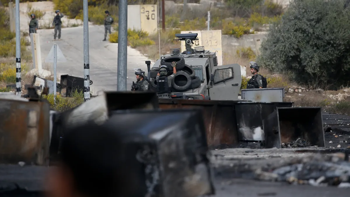 Израильские солдаты во время столкновений с палестинскими протестующими у северного въезда в город Рамалла, недалеко от израильского поселения Бейт-Эль, 20 октября. Фото: EPA-EFE / ALAA BADARNEH