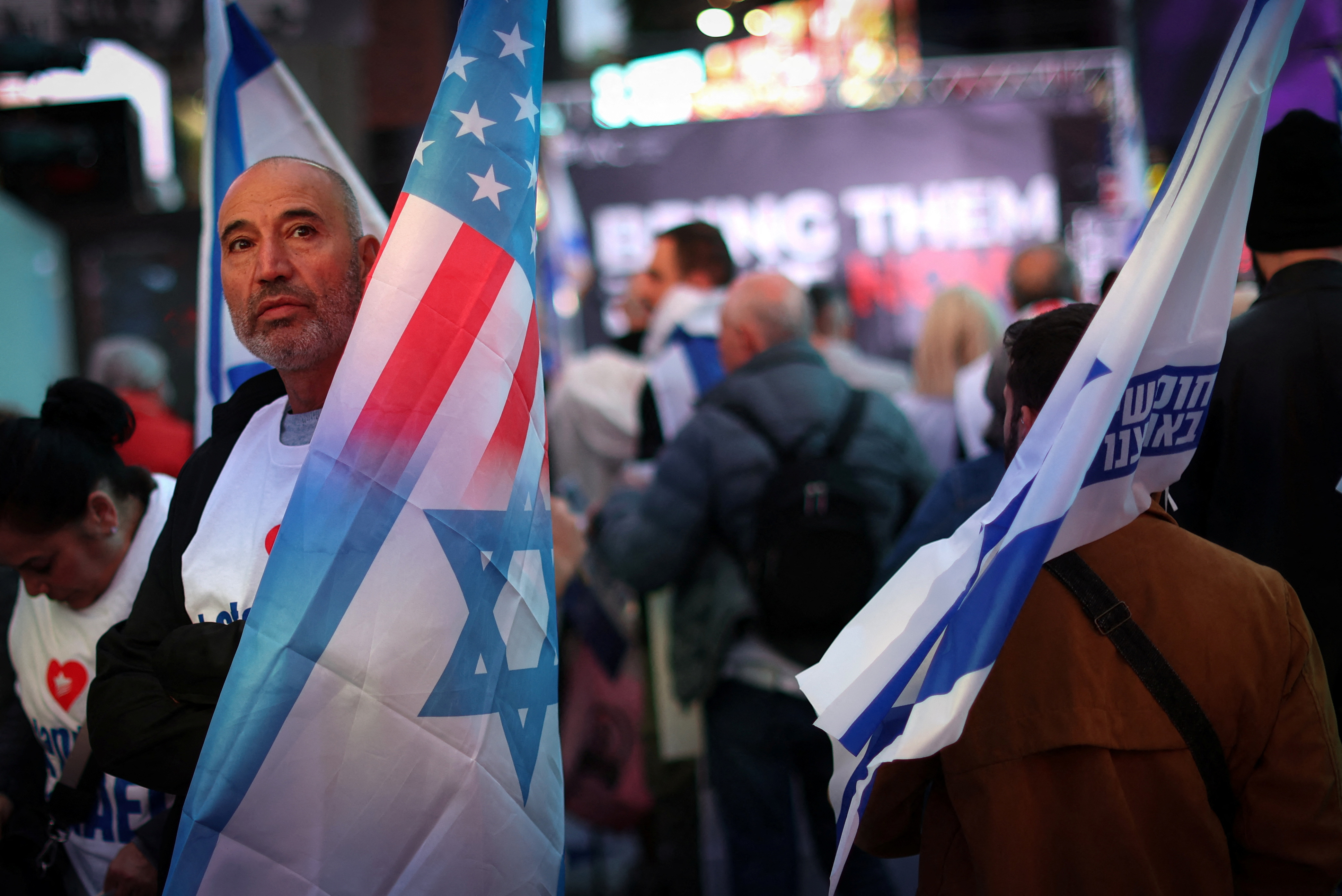 Сотни демонстрантов собрались на Таймс-сквер в Нью-Йорке с требованием освободить захваченных 7 октября ХАМАС людей в Израиле. На плакатах были изображены лица людей, предположительно, захваченных джихадистами. Собравшиеся скандировали "Верните их домой".