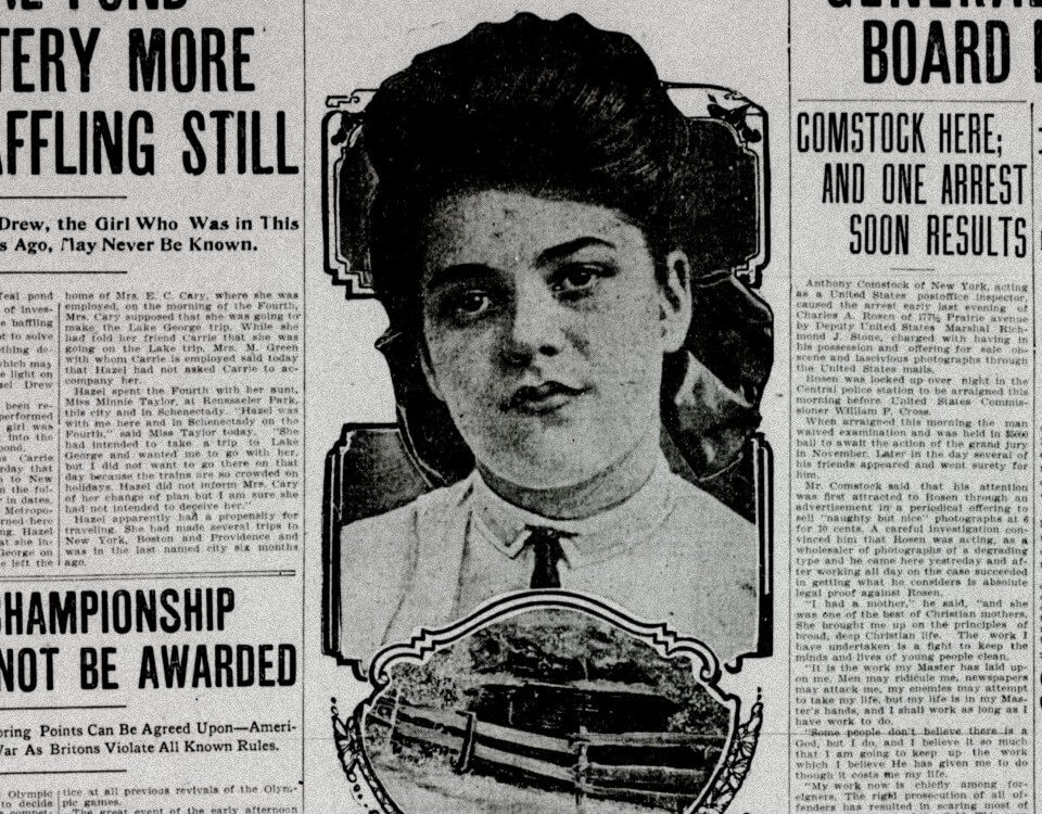 Вечером 7 июля 1908 года года 20-летняя гувернантка Хейзел Дрю прогуливалась по Табортон-роуд, лесному району небольшого курортного городка Сэнд-Лейк в северной части штата Нью-Йорк. Девушка несла в руках черную соломенную шляпу, украшенную тремя большими перьями и булавкой в виде буквы Х.