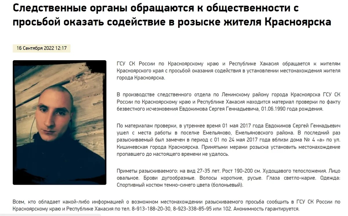 В мае 2017 года пропал воспитанник детдома Сергей Евдокимов — к тому моменту ему было 26 лет, трудился подсобным рабочим на ферме в Емельянове, пригороде Красноярска. Получил от государства квартиру: бедолажная окраина на правобережье города — Ленинский район, поселок Энергетиков, улица Кишиневская. С работы парень уезжал на выходные домой, в тот раз уехал на майские. И не вернулся, на звонки не отвечал, работодатель пошла в полицию. Выяснили, что последний раз его видели в Энергетиках.