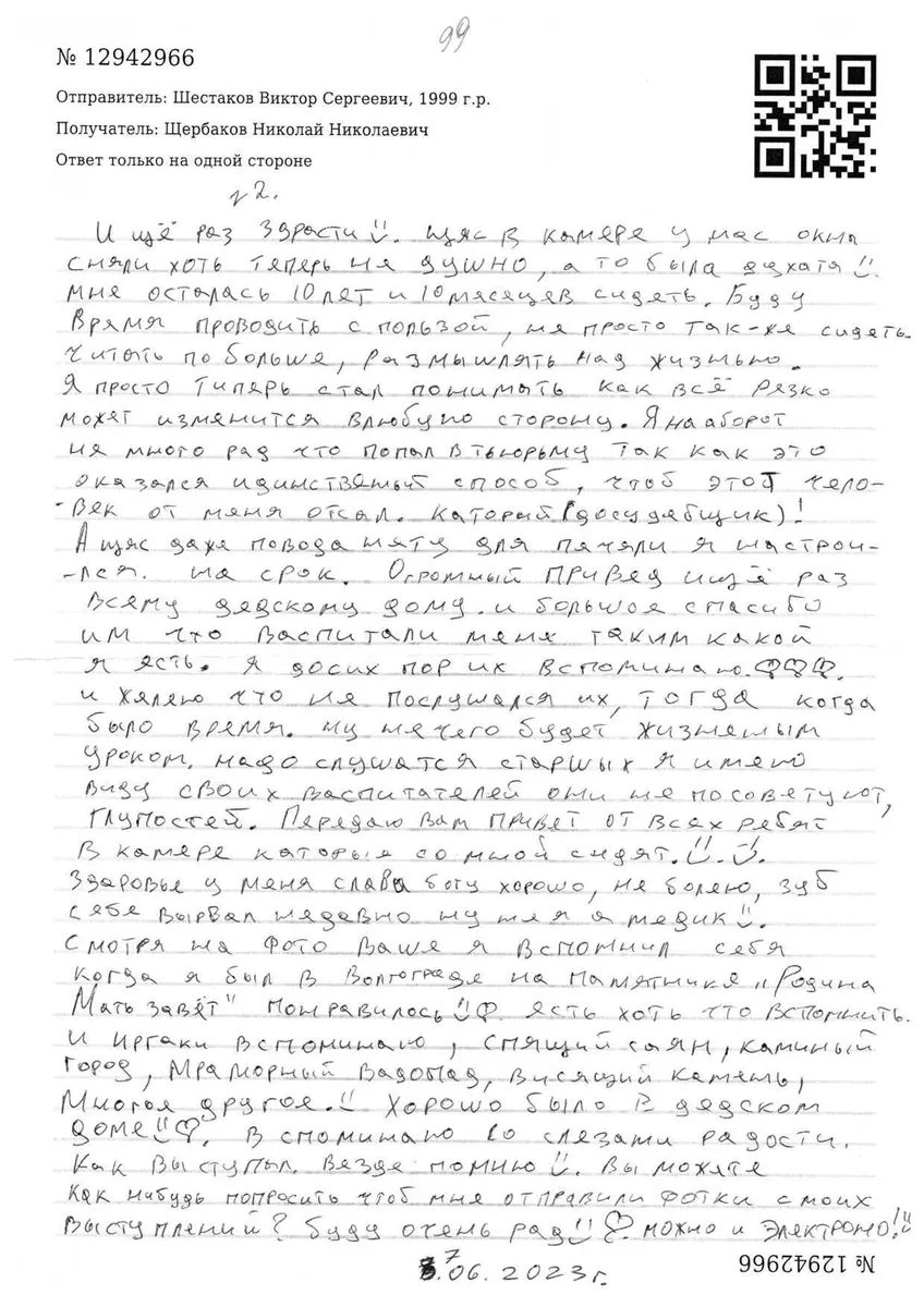 «Я понимаю что вам моя идея не понравится и что вы на меня разозлитесь! Что вы столько усилий на меня потратили и все зря! Но порой мне уже мысль приходит в голову об том чтоб уехать на [СВО]! Только ваши письма с потдержкой не дают отпускать руки и надеятся на лудшее! Но желание уехать на [СВО] порой все перебарывает. Только одно держит пока! Что вы потом скажете мне что зря старались! А так хоть поеду на *** [СВО] статья моя позволяет. Так хоть деньги детскому дому буду отправлять. Хоть им и не нужны деньги такой ценой. Но дедский дом для меня очень многое сделал. Хоть и не пишет мне но все равно любит».