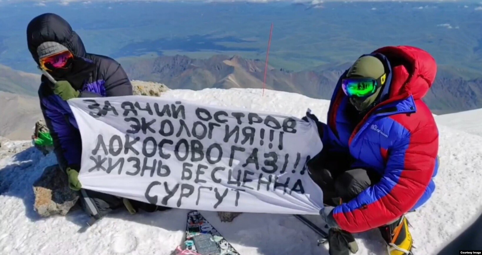 "Зайчий остров Экология!!! Локосово – газ!!! Жизнь бесценна Сургут" – транспарант с такой надписью держат на продуваемой всеми ветрами заснеженной вершине Эльбруса отец и сын. На их лицах горнолыжные маски и очки с высокой степенью защиты. Сильный ветер мешает говорить и практически вырывает транспарант из рук.