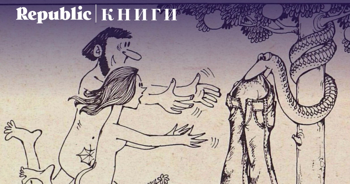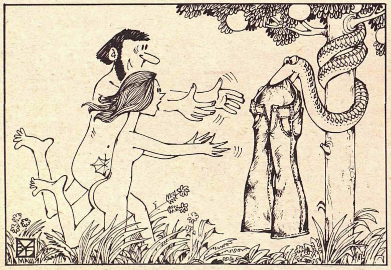 Змей-искуситель соблазняет Адама и Еву джинсами. Карикатура Владимира Уборевича-Боровского, журнал «Крокодил», 1970