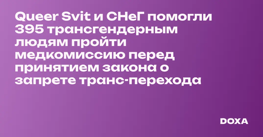 Правозащитные сообщества Queer Svit и небинарная инициатива СНеГ, а также группа анонимных активисто:к рассказали, что за несколько месяцев до принятия закона о запрете трансперехода смогли помочь 395 трансгендерным и небинарным людям пройти медкомиссию для смены документов.