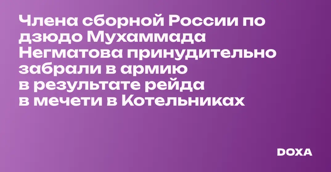 19-летнего Мухаммада Негматова, члена сборной России по дзюдо, принудительно забрали армию в ходе рейда на мечеть в подмосковных Котельниках, сообщили «Важные истории». У Негматова есть болезнь сердца. Сейчас спортсмен уже в войсках.