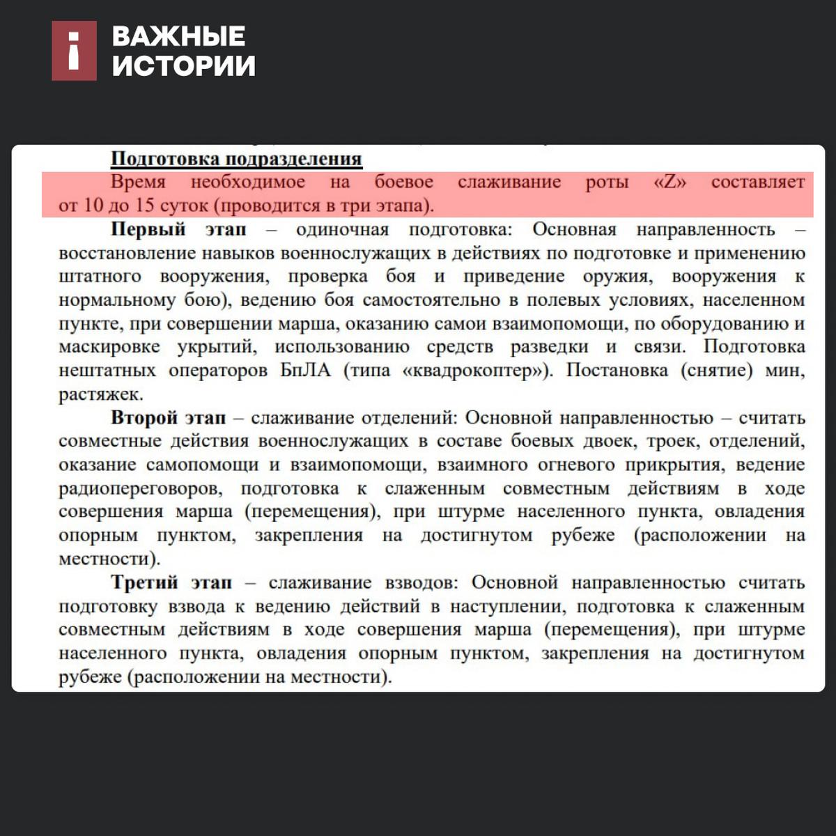 На подготовку заключенных к войне отведено только 10–15 суток, говорится в документе. Тренировки идут в три этапа: от индивидуальной подготовки до слаживания взводов.