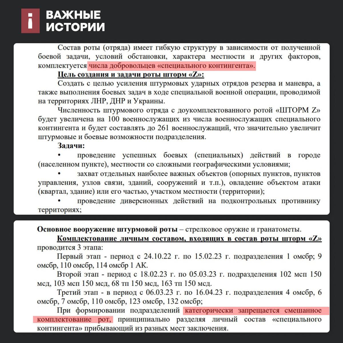Из положения также следует, что первые «штурмовые роты Z» начали формировать в октябре прошлого года и закончили этой весной. При этом вербовать заключенных Минобороны начало примерно в феврале 2023 года — тогда же это запретили делать ЧВК «Вагнер». Рота Z из 100 человек приставляется к штурмовым отрядам для наращивания численности.
