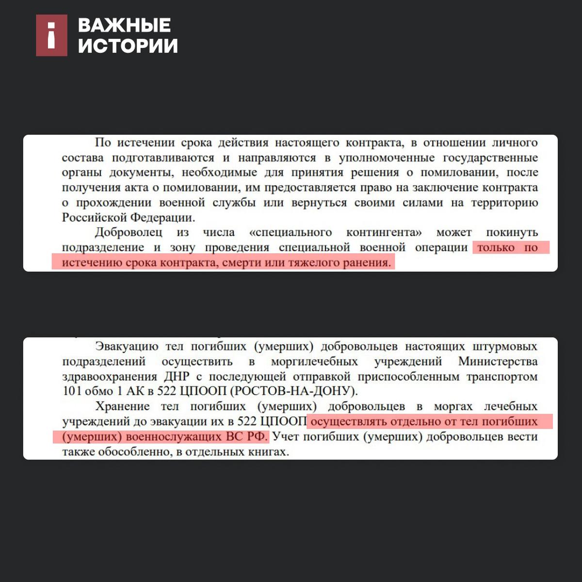 «В сопроводительных документах на раненых и больных указывать "категория К"», — сказано в документе. Ранее было известно лишь о том, что буквой «К» заключенных обозначает ЧВК «Вагнер». Также положение предписывает хранить трупы погибших заключенных в моргах только отдельно от трупов военнослужащих ВС РФ.