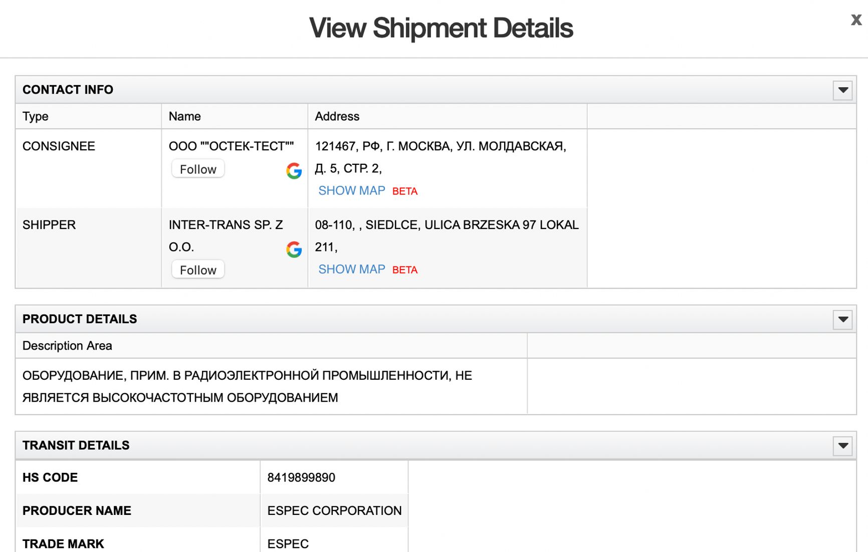 Завозят нужные для производства «Кинжалов» товары и из Европы. Так, согласно сайту госзакупок, камеры тепла и холода производства «Espec» НПК «КБМ» получает от московского ООО «Остек-Тест». Эта фирма даже во время войны, как показывают данные ImportGenius, продолжила импортировать оборудование Espec из Польши. Отправителем выступала компания Intertrans Sp. z o.o. из города Седльце (польские власти уже обратили на нее внимание).