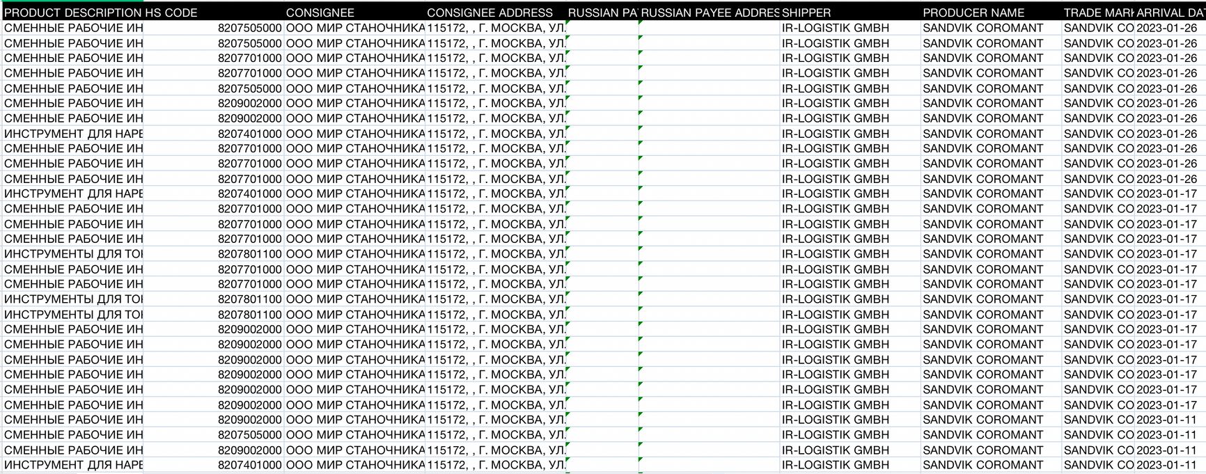 Поставщик НПК «КБМ» ружейных сверл и других инструментов производителя Sandvik — ООО «Мир станочника». А получает продукцию Sandvik этот российский оборонный подрядчик от IR-Logistik GMBH из Берлина. К примеру, в январе этого года была осуществлена поставка сменных рабочих инструментов.