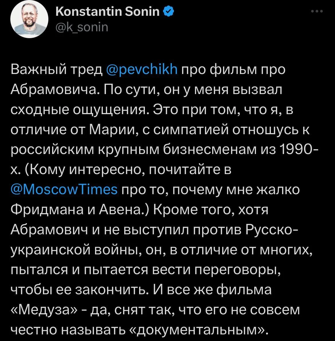 Экономист Константин Сонин пишет, что по сути фильм у него «вызвал сходные ощущения» с тем, о чём пишет Певчих, но он, в отличие от Марии, «с симпатией относится к российским крупным бизнесменам из 1990-х» и, что «хоть Абрамович и не выступил против Русско-украинской войны, он, в отличие от многих, пытался и пытается вести переговоры, чтобы ее закончить». Сонин также не может назвать фильм «документальным», но не уверен, «что этот фильм — PR-проект Абрамовича».