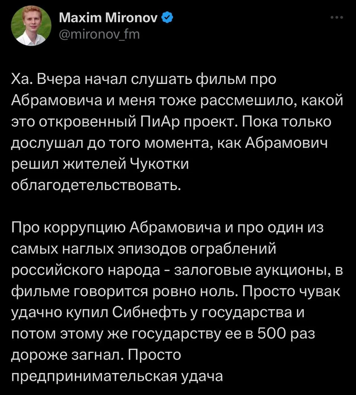 Экономист Максим Миронов называет фильм «откровенным пиар-проектом», в котором ровно ноль «про коррупцию Абрамовича и про один из самых наглых эпизодов ограблений российского народа — залоговые аукционы».