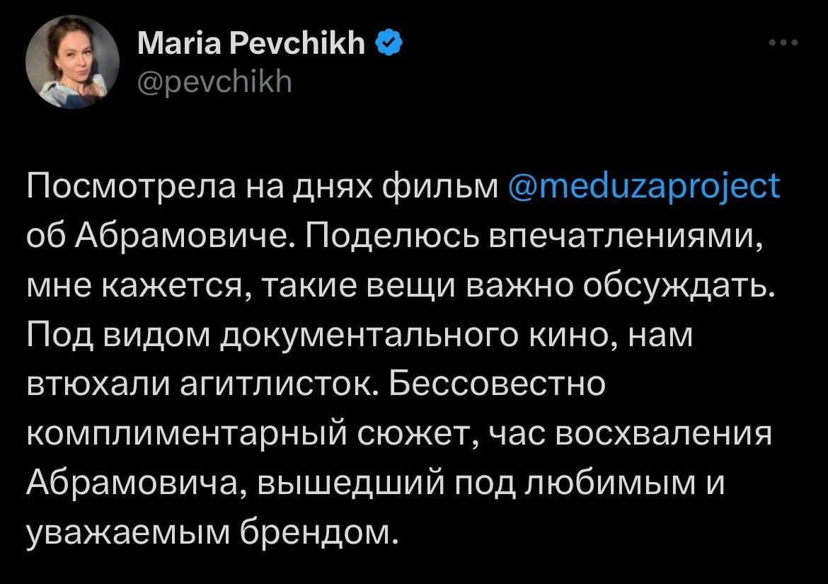 Об опубликованном «Медузой» фильме «“Коллекция Абрамовича”. Биография Романа Абрамовича», который был снят берлинской киностудией Narra и кооперативом независимых журналистов «Берег», уже высказались многие представители либеральной общественности: от главы Фонда борьбы с коррупцией Марии Певчих до журналиста Олега Кашина, публициста Андрея Мальгина и экономиста Константина Сонина. Если Мальгин обошелся одним предложением: «Интересно, сколько заплатил Абрамович «Медузе» за фильм о нём?», то тред с Марией Певчих в «X» (экс-твиттер) набрал более миллиона просмотров.
