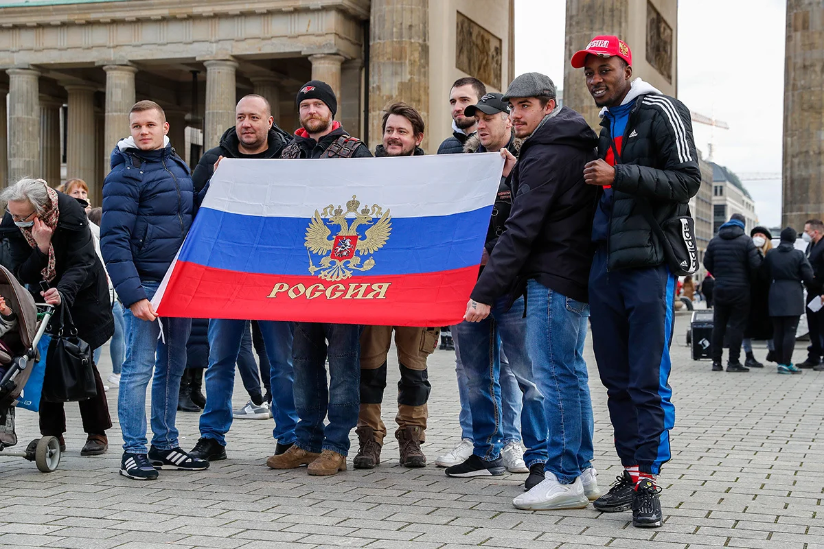 Демонстранты с БСБ-флагом на фоне пророссийского автозабега в Гановере в апреле 2022. Фото: Michael Matthey / picture alliance / Getty Images