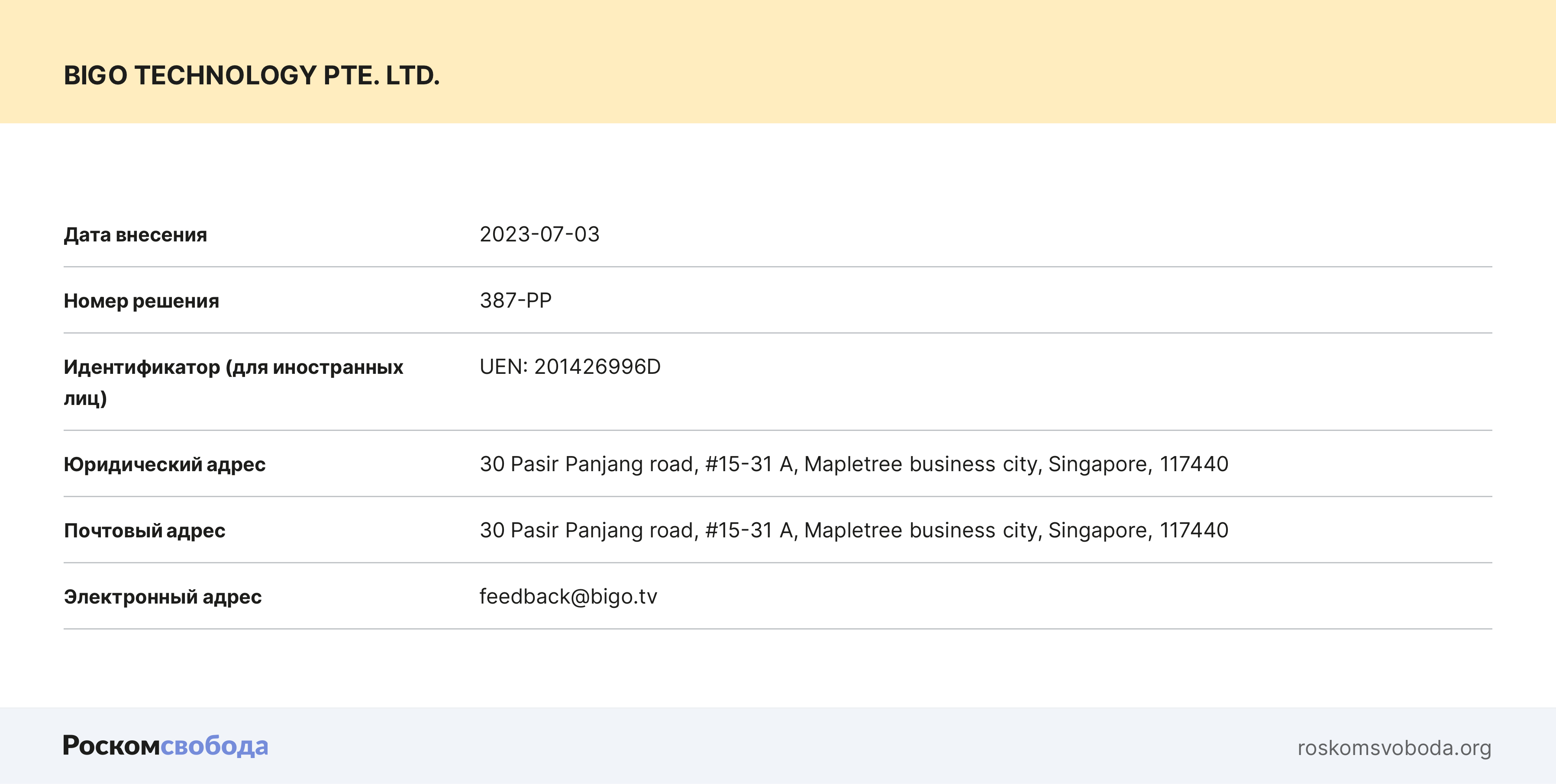 И четвёртый иностранный «организатор распространения информации» — сингапурский стриминговый сервис для live-трансляций Bigo: