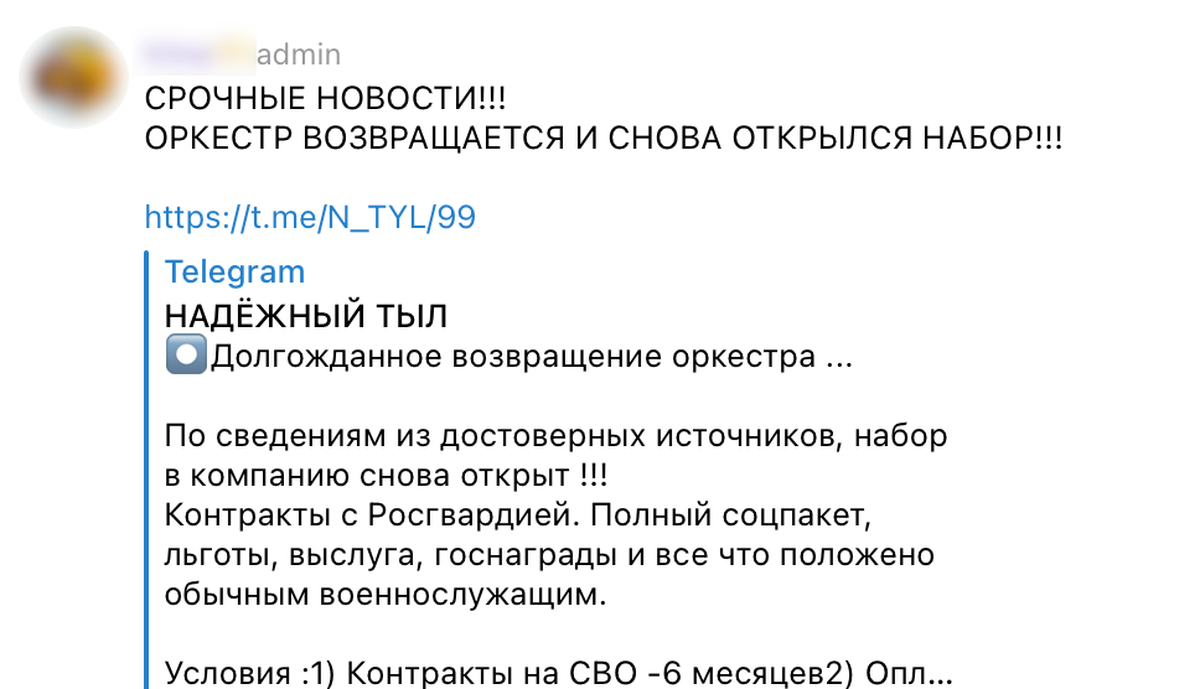 Бывшим боевикам ЧВК «Вагнер» предложили заключить контракт с новым наемническим подразделением в составе Росгвардии. Информация об этом появилась в чатах родственников бойцов ЧВК, однако позже была удалена.