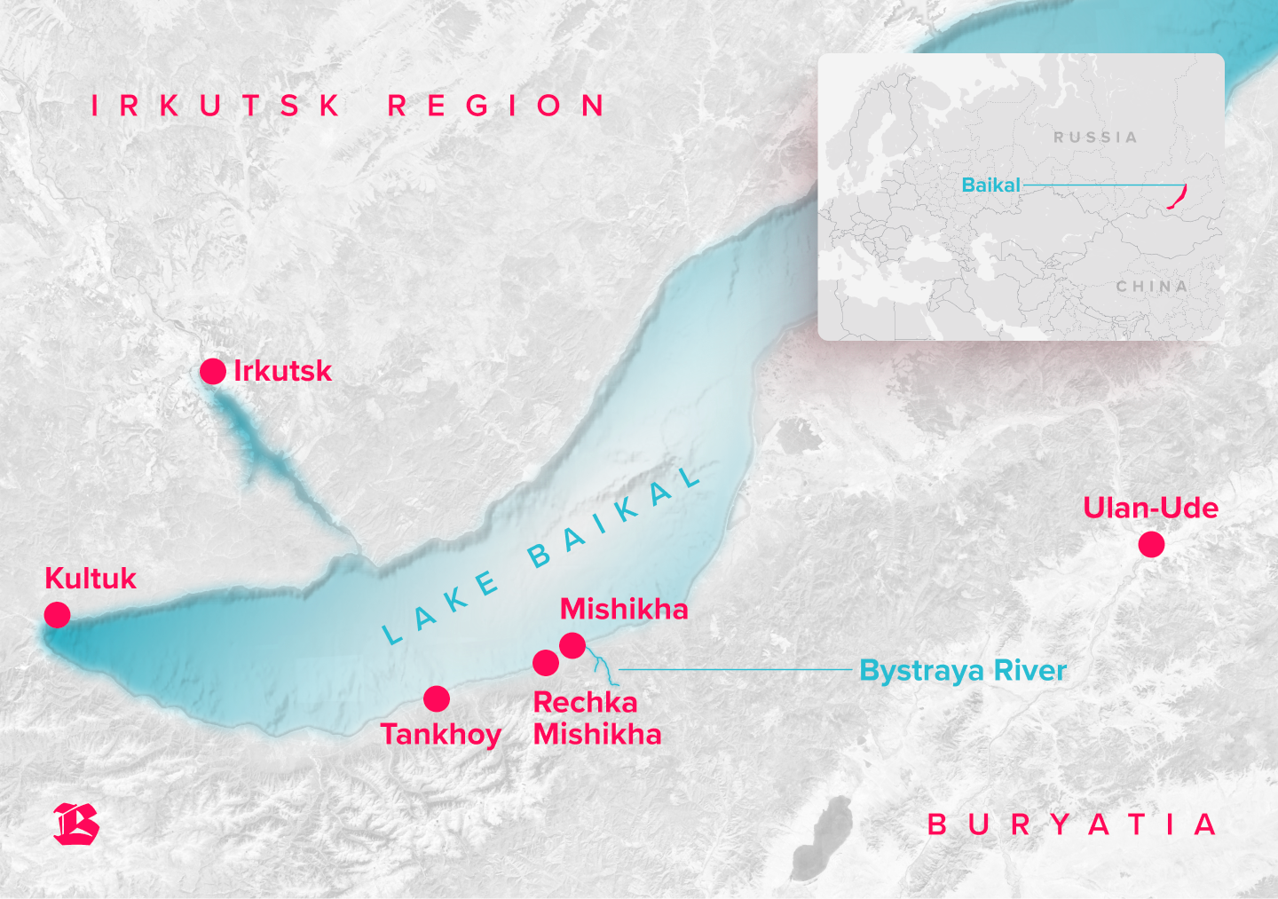A metal marker stands in a small clearing on the shores of Lake Baikal, where the Bystraya River flows into the world’s deepest lake. The riverbank is overgrown with bushes, but there’s a trampled path coming from the nearest village. The locals come here to fish hoping to catch omul, a type of whitefish, though there are barely any left in the lake.