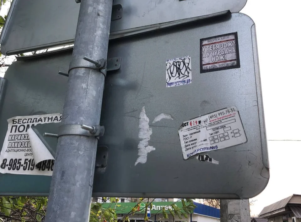Стены хозяйственных построек беспорядочно облеплены объявлениями. Их можно разделить на три типа. Первый — предложение работы с питанием и проживанием. Второй — бесплатная помощь наркозависимым и алкозависимым. Третий — афиши представлений в местном Доме культуры. Периодически встречаются расистские призывы: «Вооружайся. У ТЕБЯ ЗОЖ? А У ЧУРБАНА НОЖ. Не будь терпилой».