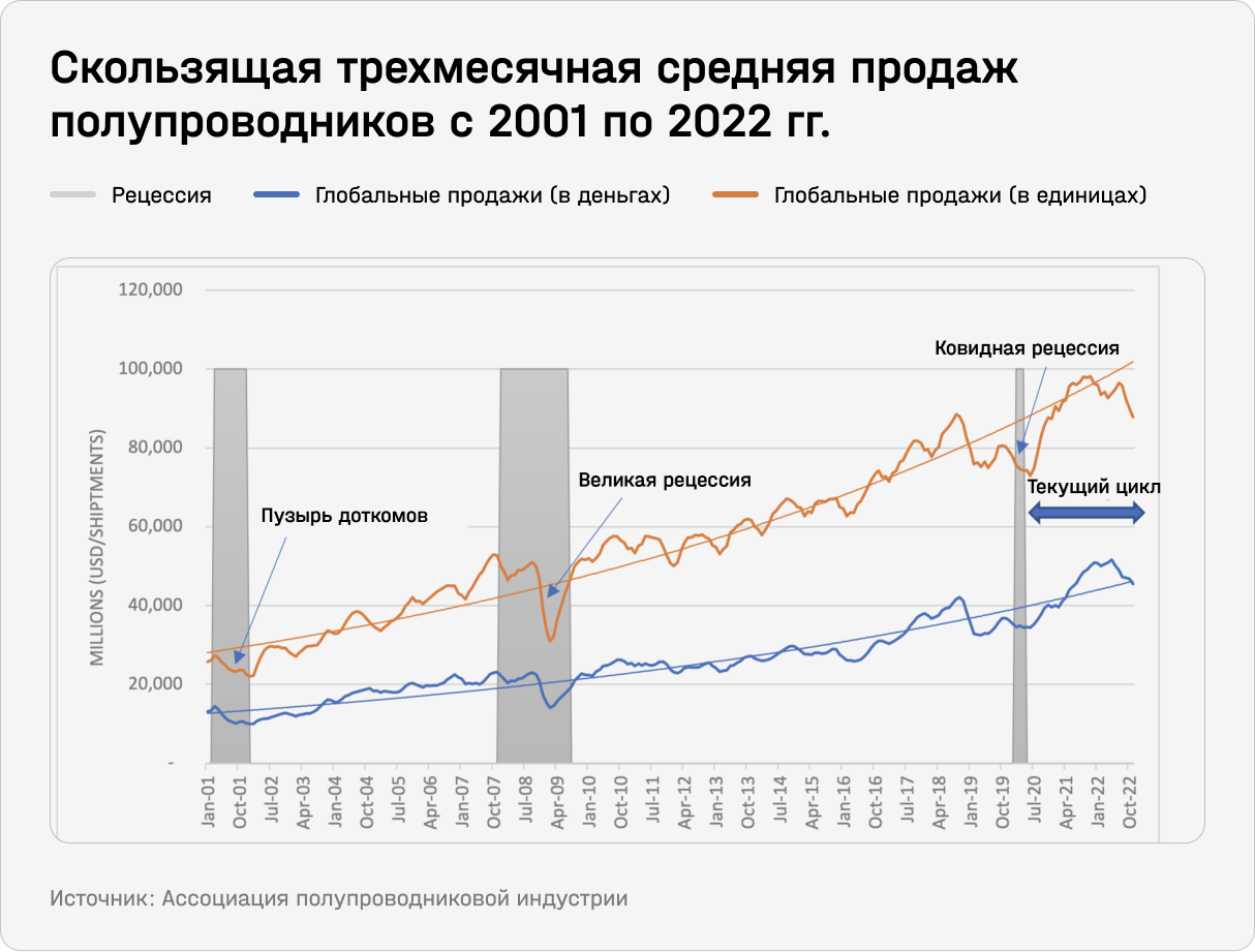 Полупроводники — незаменимый компонент всех электронных устройств. Несмотря на циклическое замедление роста спроса в 2022-м, полупроводниковая промышленность демонстрирует устойчивый рост на протяжении как минимум последних двух десятилетий. Годовой объем продаж вырос со $139 млрд в 2001 году до $573,5 млрд в 2022 году, то есть на 313% (с CAGR в 6,98%).