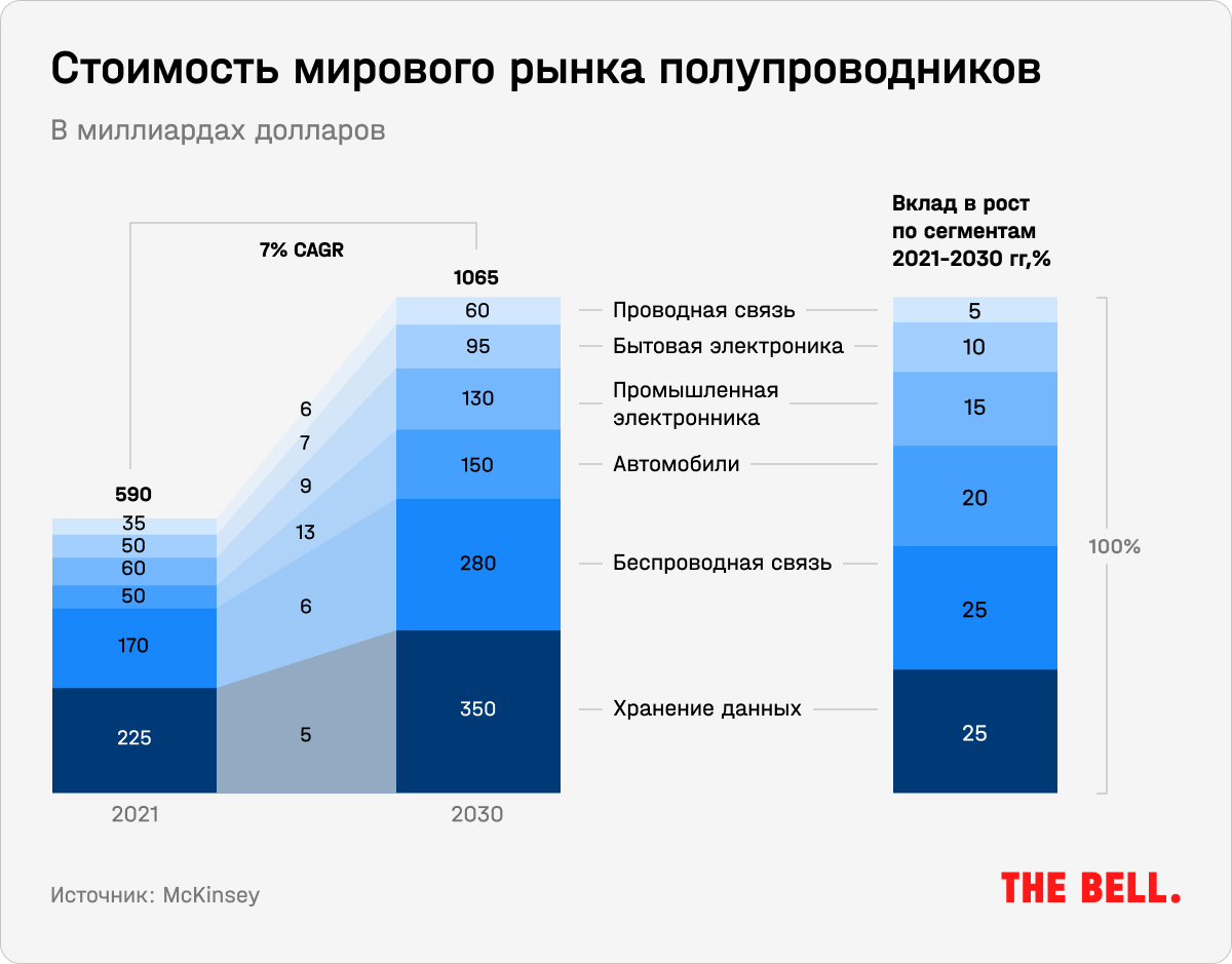 По подсчетам McKinsey, к 2030 году размер рынка может составить $1 трлн. Около 70% роста к этому моменту будет обеспечено автомобилями (особенно электрокарами), хранением данных и беспроводными технологиями. Рост со стороны этих секторов будут стимулировать спрос на чипы в ближайшее десятилетие.