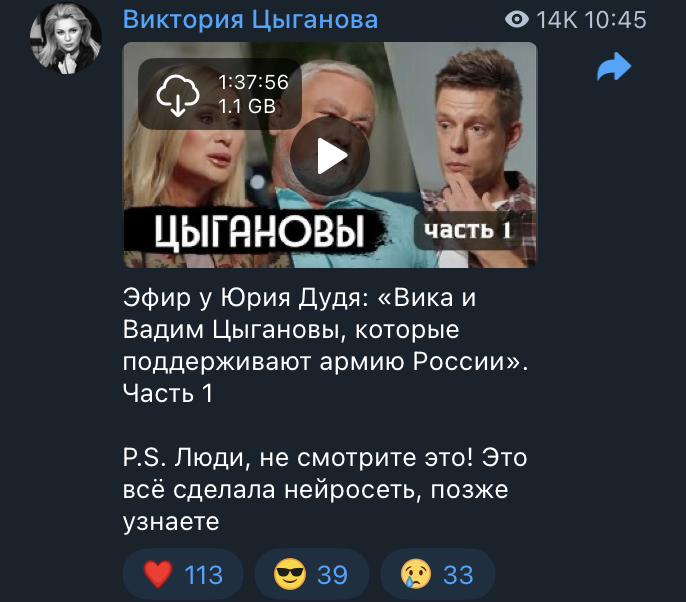 Сама Цыганова также заявила, что она и ее муж не давали интервью Дудю. «Это правда не мы, нейросеть и технологии deepfake…», — написала певица в своем телеграм-канале. При этом накануне сама Цыганова опубликовала ссылку на видео журналиста со словами: «Мы на на эфире у иностранного агента — Юрия Дудя».