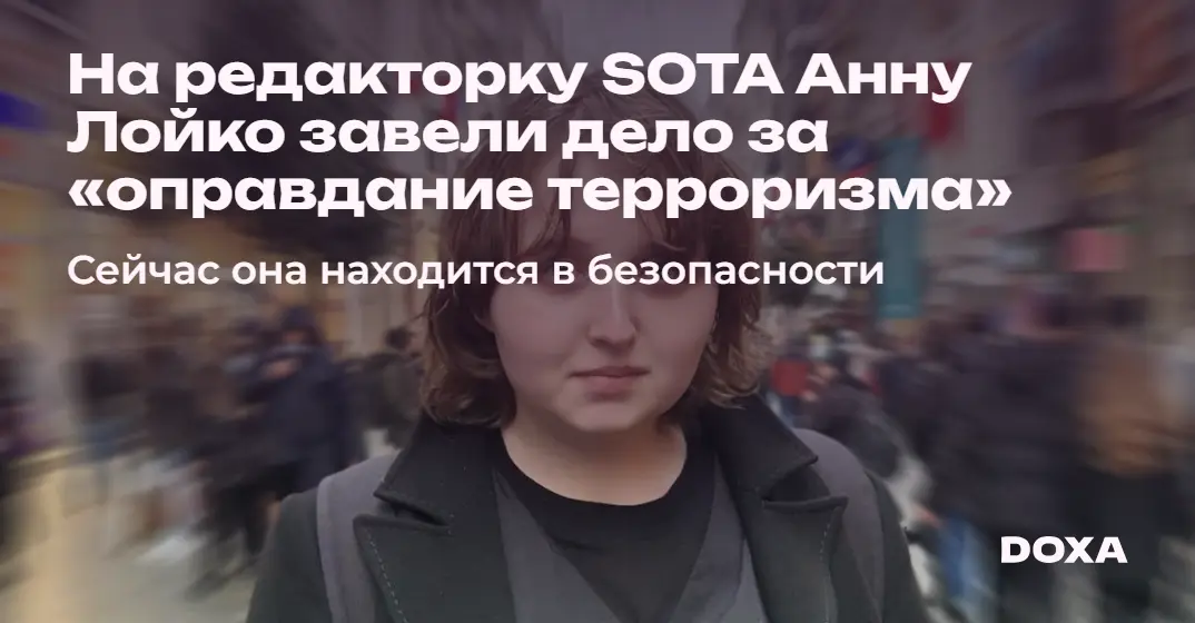 На редакторку SOTA Анну Лойко завели дело по статье об «оправдании терроризма» и объявили в розыск, сообщает связанный с силовиками телеграм-канал Baza. В SOTA сообщают, что Анна и редакция не располагали этими подробностями, так что речь идет о намеренной утечке со стороны следствия. Отмечается, что в публичной базе розыска Анны все еще нет.