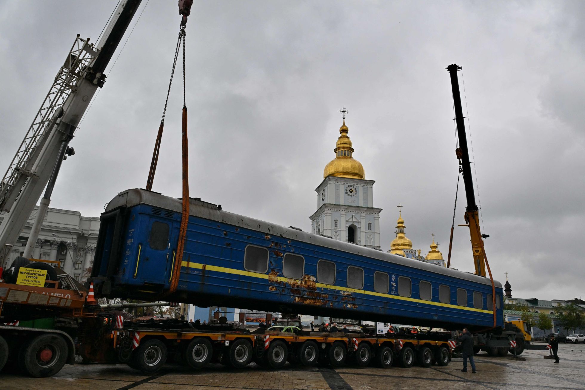 На Михайловской площади среди подбитой российской бронетехники выставили вагон пассажирского поезда, в котором весной 2022 года эвакуировались мирные жители. Во время одного из рейсов из Ирпеня поезд попал под обстрел российских войск.