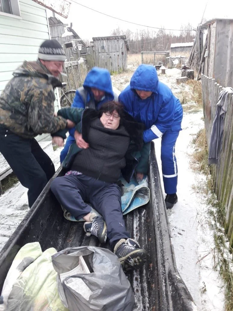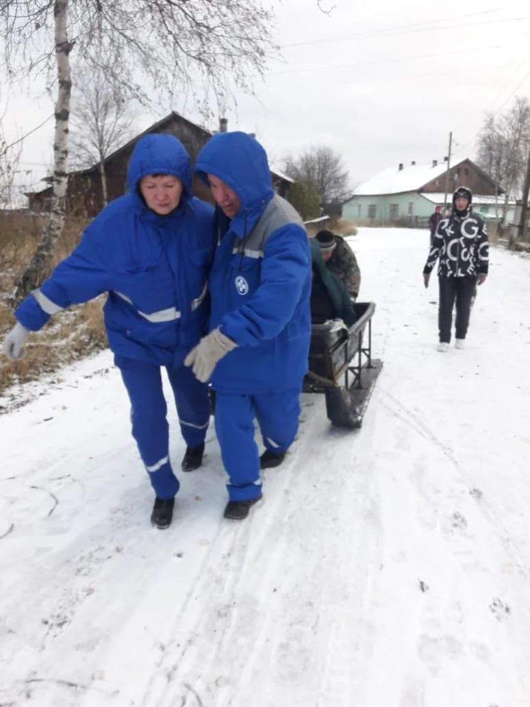 The crew was forced to transport the woman using an alternative route across the village to the ambulance by sledge.