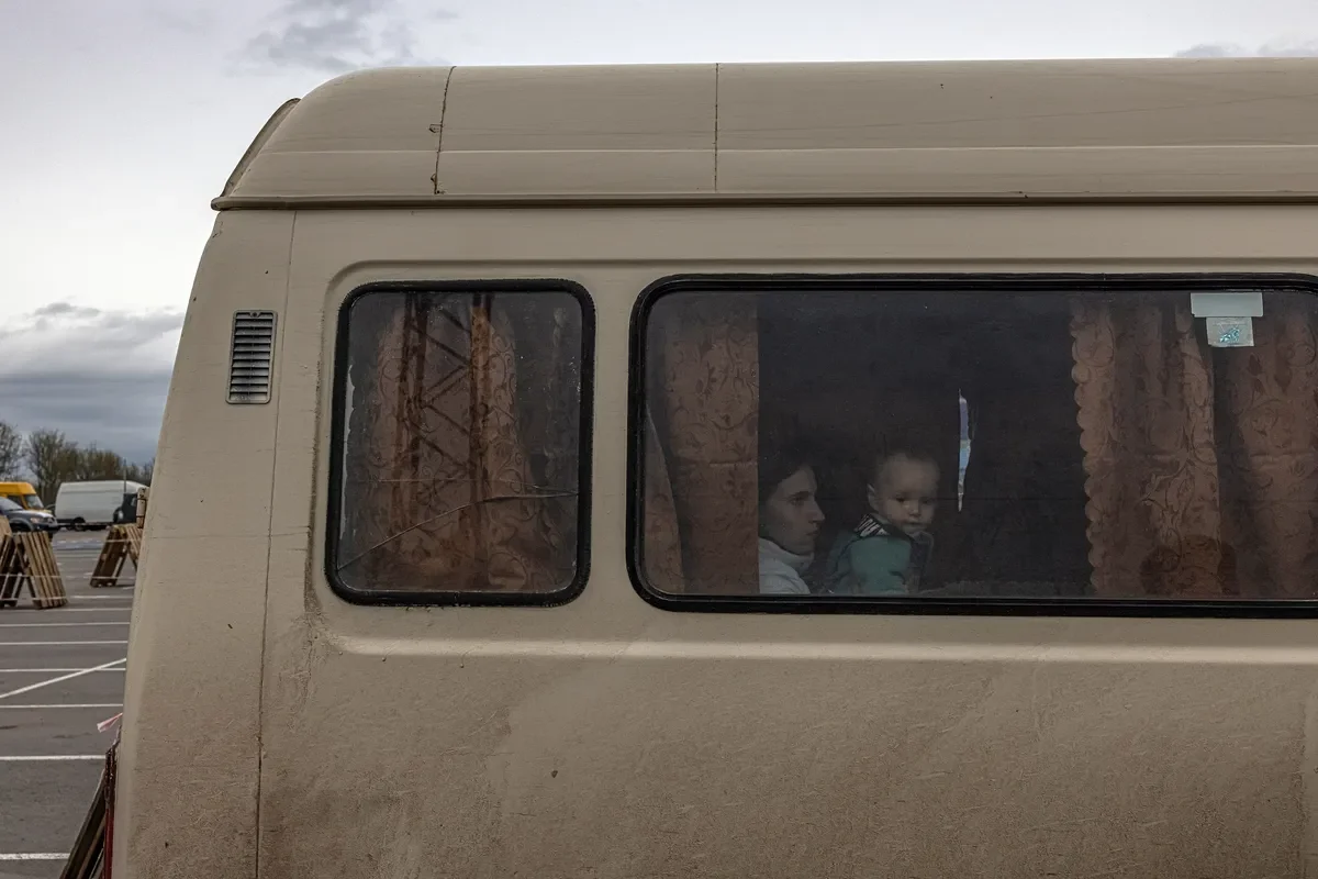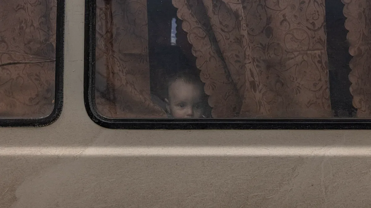 A child looks out of a minibus window in the port city of Henichesk in the Kherson region. Photo: Roman Pilipey / EPA-EFE