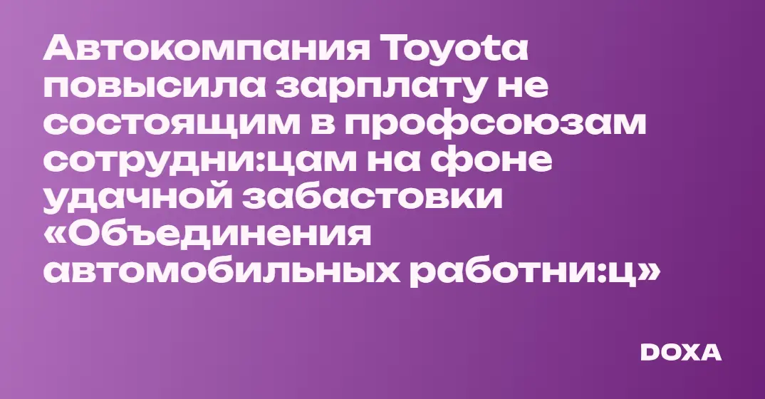 Автокомпания Toyota повысила зарплату не состоящим в профсоюзам сотрудни:цам на фоне удачной забастовки «Объединения автомобильных работни:ц»