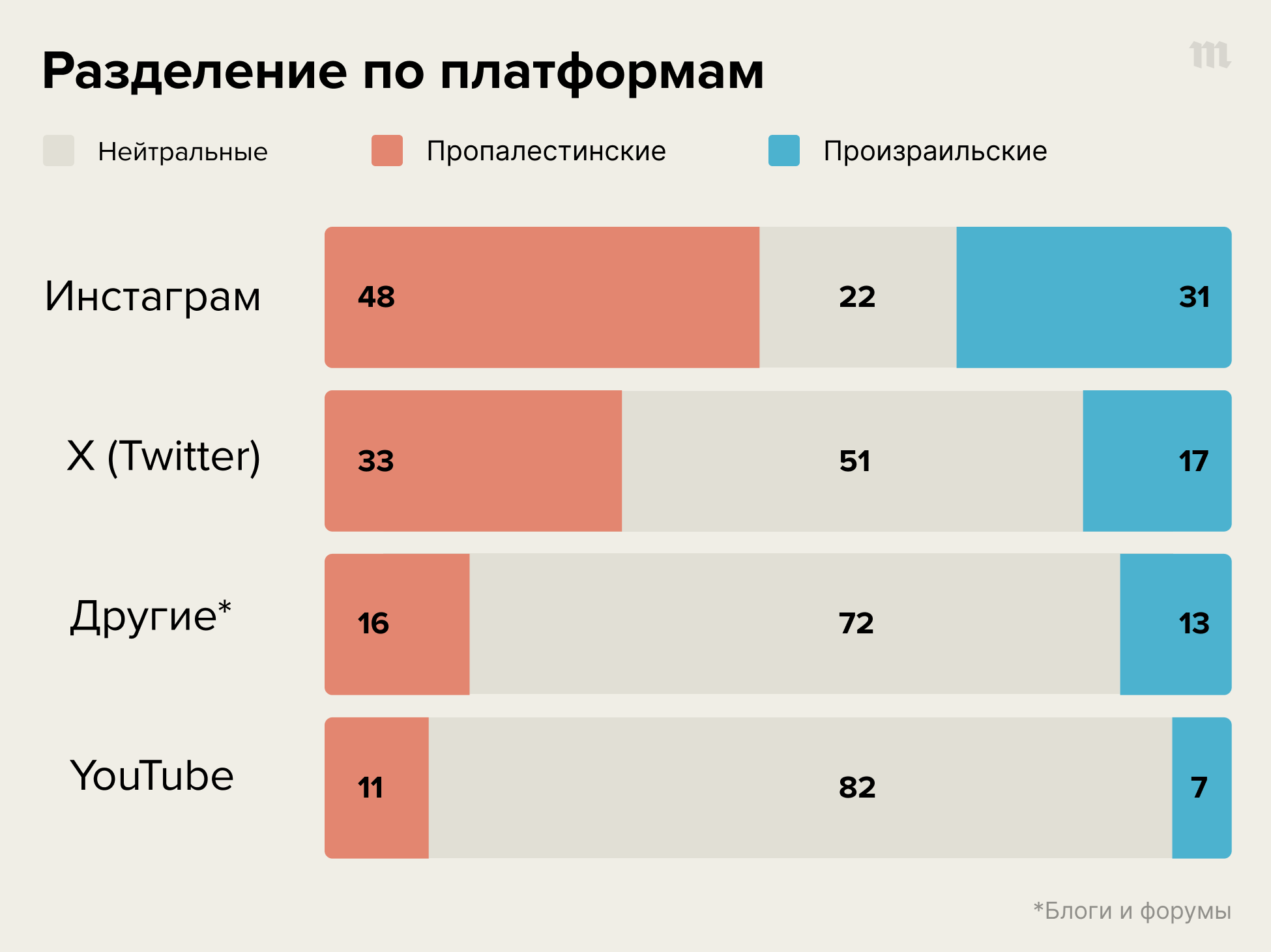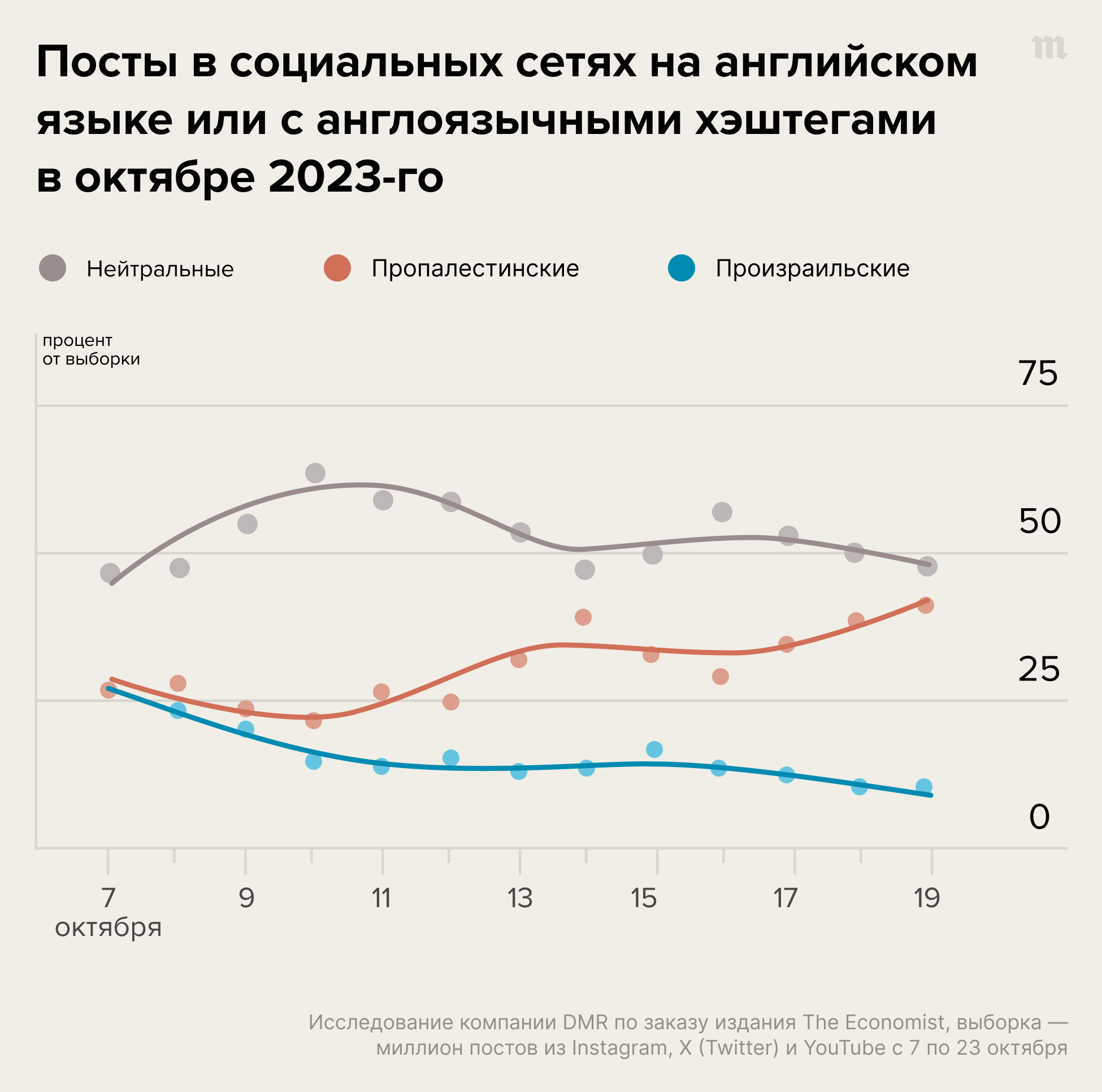 По просьбе издания The Economist компания DMR, которая проводит исследования с помощью искусственного интеллекта, проанализировала миллион постов, реплаев и видеороликов на тему арабо-израильского конфликта из Instagram, X (в прошлом — Twitter) и YouTube, выложенных с 7 по 23 октября. Для этого DMR собрала список хештегов с одинаковым количеством произраильских и пропалестинских терминов на английском языке — каждая запись должна была содержать хотя бы один из них.