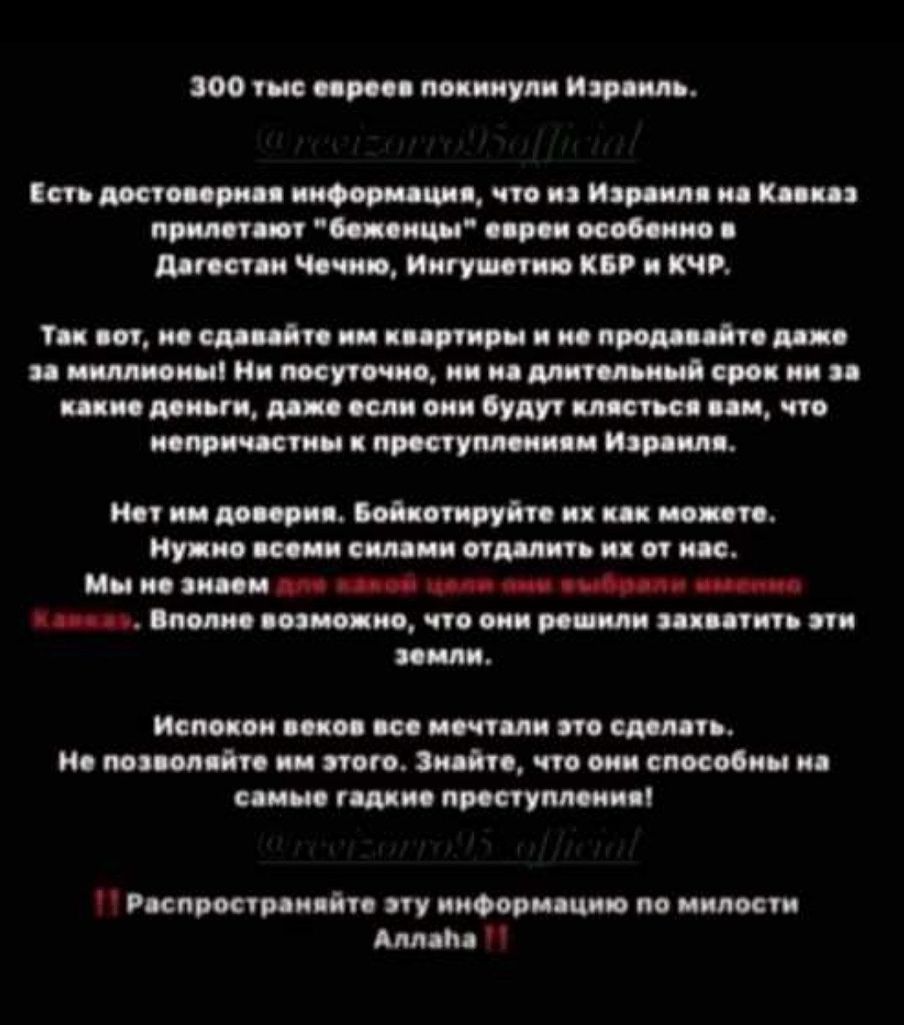 Последним подобным [ее] сообщением стала публикация, предшествующая событиям в аэропорту Махачкалы. Вкратце — в нем публиковались домыслы о том, что евреи массово переезжают на Кавказ, строят жилье и вообще хотят захватить регион. Также были указания ни в коем случае не сдавать жилье евреям.