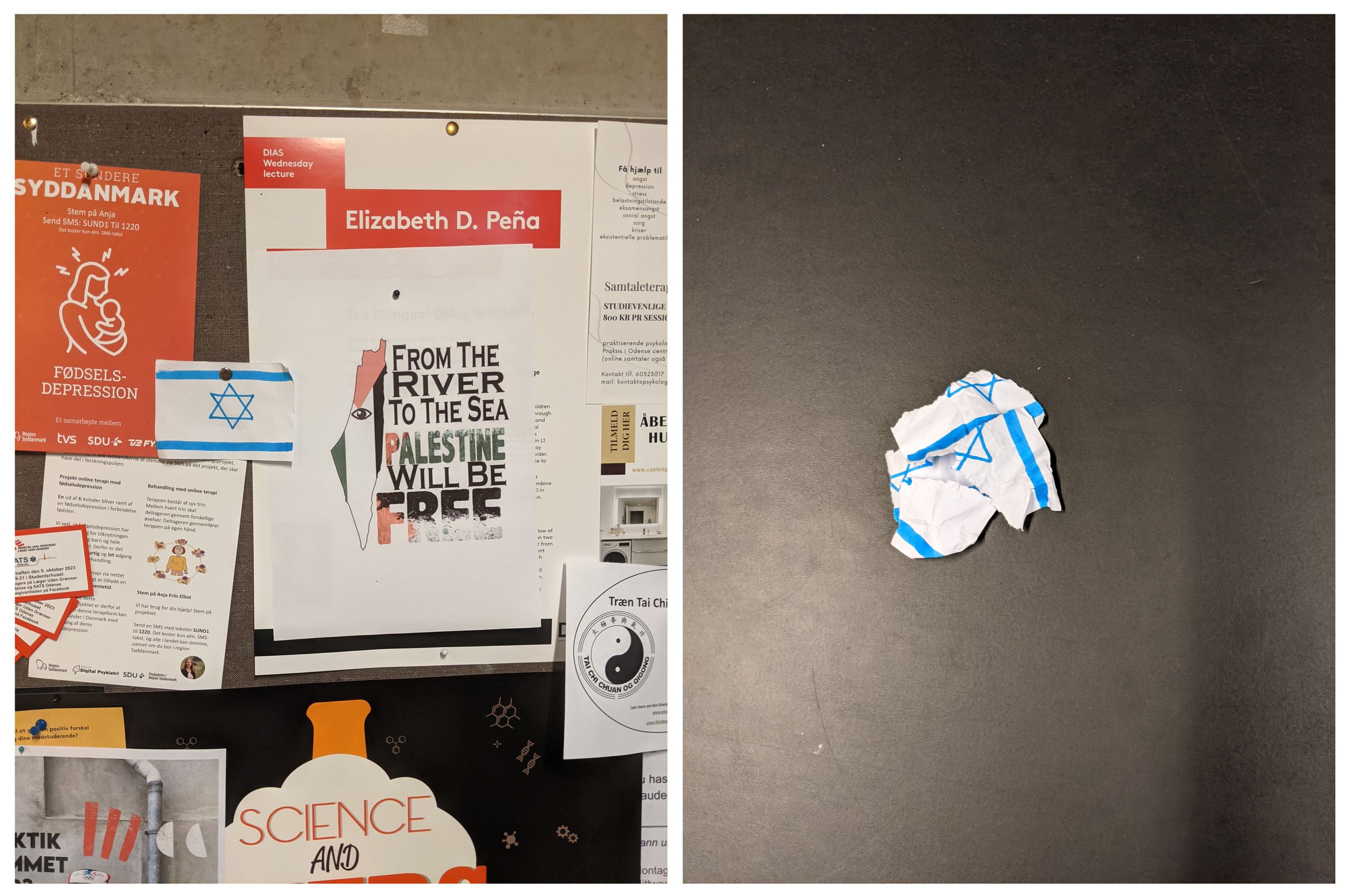 Я работаю в университете в Дании. После начала войны наш университет увешан палестинскими флагами и лозунгами, включая «From the river to the sea» (многими воспринимаемый как призыв к геноциду). Когда я вешаю рядом израильские флаги, их почти сразу срывают, несмотря на то, что ректор публично выступил против такой практики.