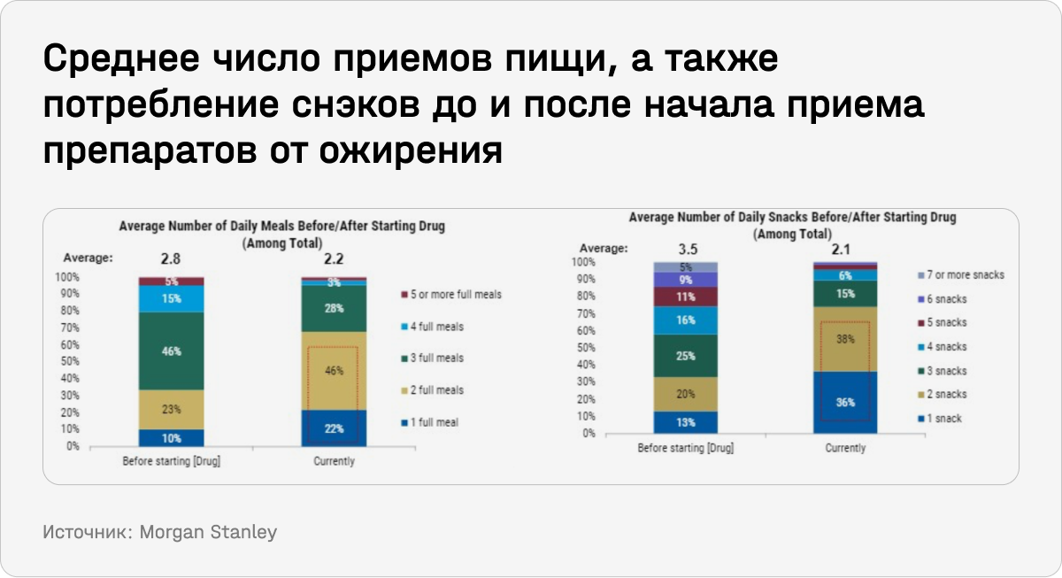 Менеджмент компаний сейчас все больше говорит о влиянии препаратов от ожирения на свой бизнес, отмечают аналитики Morgan Stanley (MS). «Мы определенно видим небольшое изменение [спроса на продукты со стороны пациентов, принимающих препараты от ожирения] по сравнению с остальными, мы видим небольшой спад в общей корзине», — признал на октябрьском звонке с аналитиками по итогам последнего квартала CFO Walmart. По итогам прошлого сезона отчетности, завершившегося в августе, упоминания лекарств от ожирения удвоились по сравнению с прошлым годом; в ходе текущего этот рост, вероятно, ускорится.
