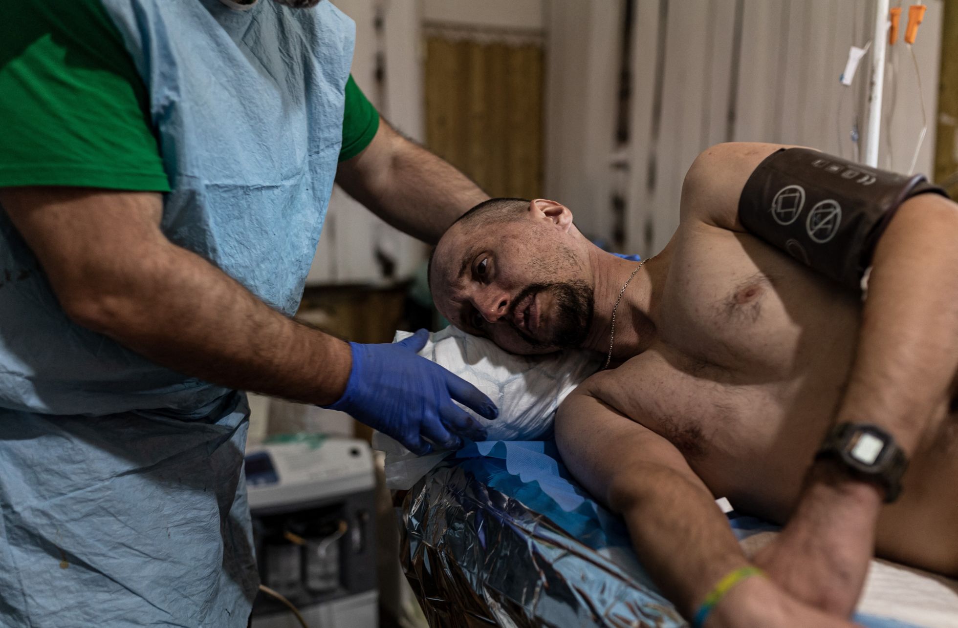 В районе Бахмута продолжаются бои — это один из участков фронта, где украинские войска ведут наступление. На фото, сделанном 4 ноября, раненый военнослужащий ВСУ в одном из медицинских пунктов на передовой.