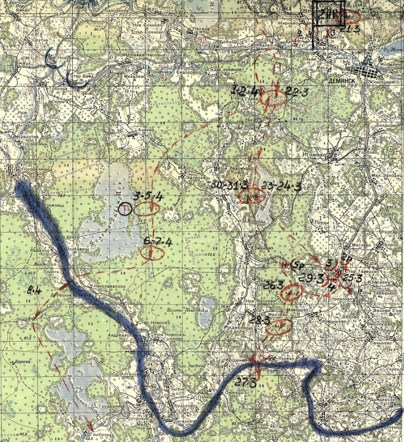 Во второй половине февраля 1942 года войскам Северо-Западного и Калининского фронтов удалось закончить окружение частей второго немецкого армейского корпуса в районе Демянска. В образовавшемся котле площадью около 3000 квадратных километров находилось 6 немецких дивизий (почти 100 тысяч человек), продолжавших, однако, упорное сопротивление по всей линии фронта и поддерживавшихся основной группировкой 16 немецкой армии посредством воздушного моста (практически ежедневно подвозилось довольствие, боеприпасы, пополнение, вывозились раненые).
