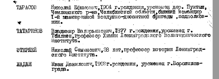 Тарасов прибыл из тюрьмы в 1939 году в 211 Воздушно-Десантную Бригаду. Я был в то время в должности начальника вещевого снабжения бригады. Тарасов меня встретил на территории банно-прачечного комбината. Бросился меня обнимать и стал плакать. Я его с трудом успокоил. Я ему сказал, что за калечество Вашей судьбы виновные наказаны. На Тарасове обмундирование было ужасно изорванное, большая борода. Привел его в баню, он помылся. Я его переодел в новое обмундирование, потом я повел его к парикмахеру. Он только сел на стул стричься и бриться, увидал себя в зеркале и заплакал. Я предложил ему покурить и стал его успокаивать. Потом я его повел в столовую и на квартиру, которую ему выделили. Тарасову предложили снова занять должность командира 211 бригады, но он не дал согласия и уехал в Москву. Вскоре я от него получил письмо, в котором он мне сообщал, что он получил назначение на должность заместителя начальника школы летчиков Гидроавиации в Крыму по строевой части.