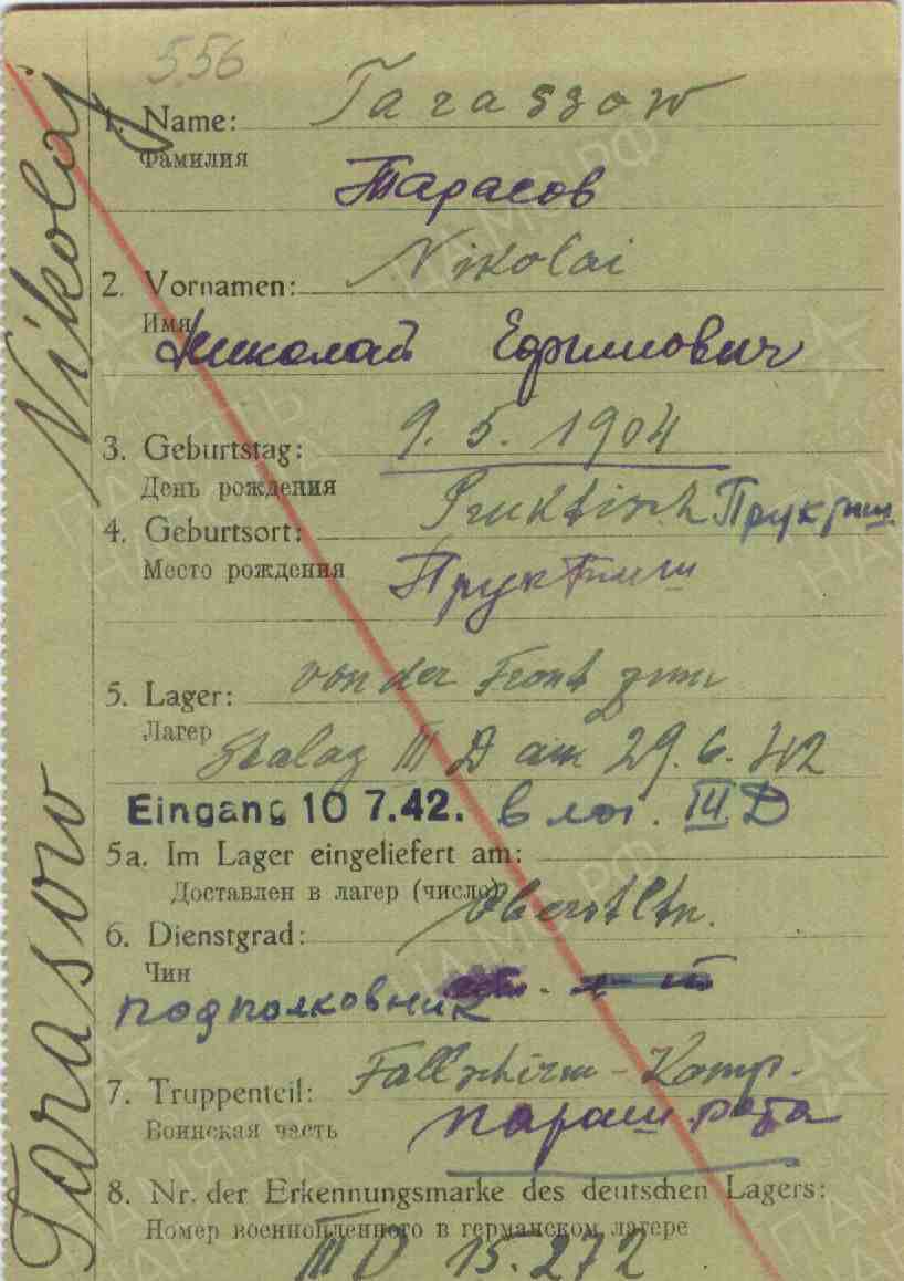 Игорь Петров: 25 октября 1937 года Николай Тарасов был арестован по обвинению в принадлежности к контрреволюционной организации. Впоследствии, уже на немецком допросе, он утверждал, что действительно принадлежал к ближнему кругу комкора Бориса Горбачева, не любившего Сталина (добавим: арестованного в мае 1937 года и вскоре расстрелянного), который в свою очередь примыкал к оппозиционной группе Тухачевского. Тут можно добавить, что версия о существовавшем антисталинском военном заговоре, довольно часто встречалась в допросах советских офицеров и в рассказах тех из них, кто после войны остался на Западе.