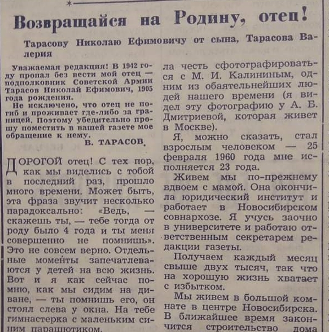 Уважаемая редакция! В 1942 году пропал без вести мой отец – подполковник Советской Армии Тарасов Николай Ефимович, 1905 года рождения.