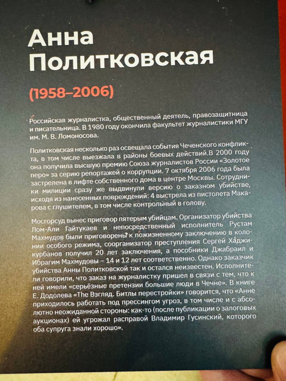 Критика. Посетили выставки обратили внимание на то, что в описании к фотографиям убитых журналистов акцент сделан именно на версии произошедшего, которую дают российские власти.
