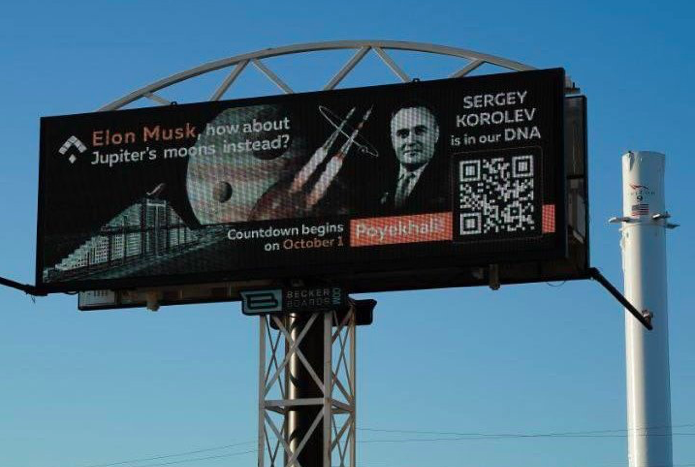 Незадолго до презентации в городе Хаторн, Калифорния, США, напротив офиса Space X, ОЭЗ "Алабуга" разместила билборд. Как пишет местное издание "Татар-информ", "миллиардеру напомнили, что именно в жилах русских ученых течет кровь Сергея Королева". Текст на баннере гласил: "Илон Маск, что насчет спутников Юпитера? Обратный отсчет начинается 1 октября. Поехали!" На щите был и QR-код – по ссылке размещено видео с инвестпроектами "Алабуги" на Юпитере.