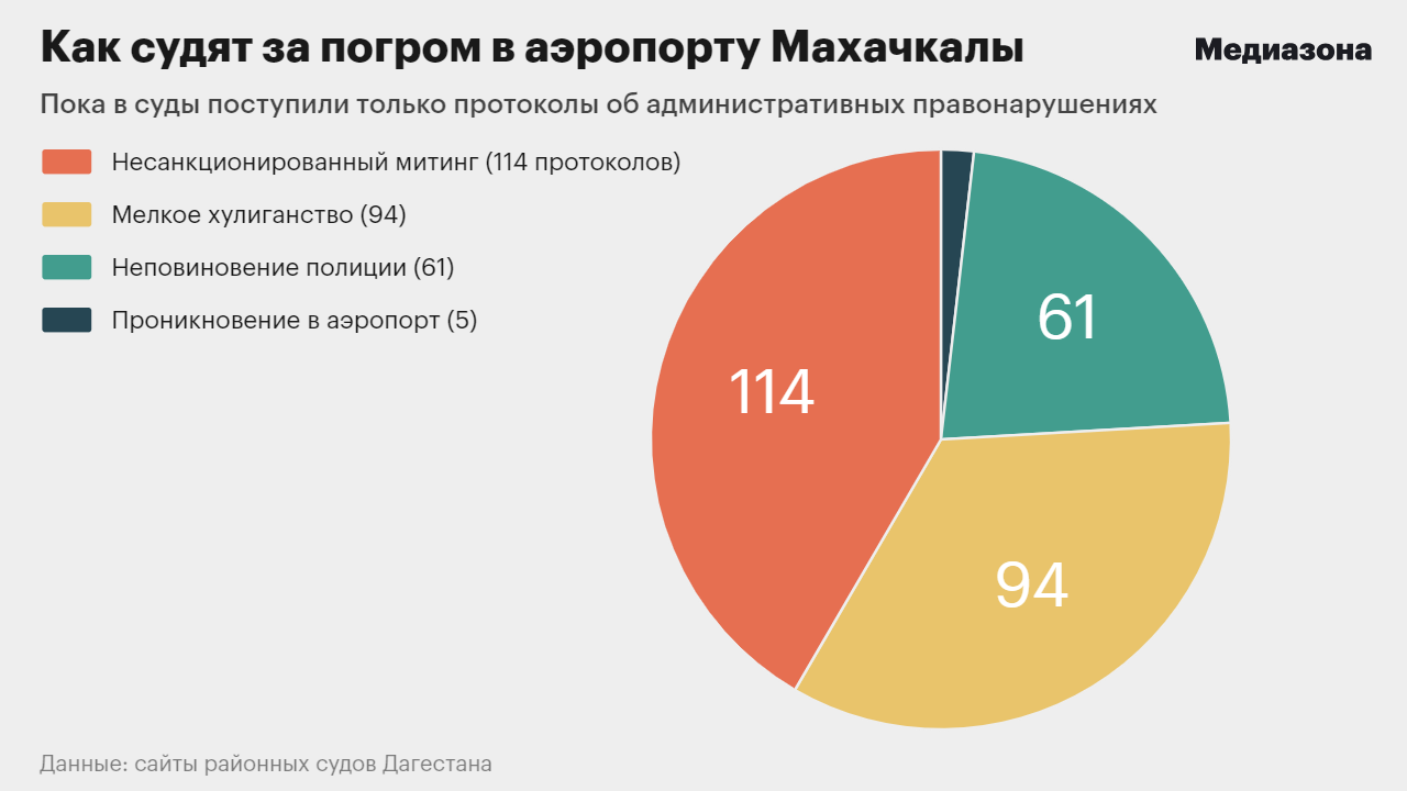 По остальным категориям дел сведения на сайтах районных судов не соответствуют тому, о чем официально объявляет республиканский главк МВД. По утверждению властей, большинство задержанных (107 человек) привлечены к ответственности за мелкое хулиганство, но на сайтах всех судов Дагестана неделю спустя значатся только 94 дела по статье 20.1 КоАП. Причем среди них есть и бытовые дела, никак не связанные с погромом в аэропорту.