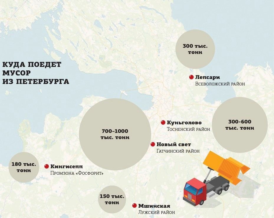 300 тысяч тонн отходов доставят на «Полигон ТБО» в деревне Лепсари Всеволожского района. 180 тысяч тонн примет полигон в Кингисеппе, который планируют запустить в середине 2024 года. 150 тысяч тонн придется на полигон «Авто-Беркут» в поселке Мшинская Лужского района.