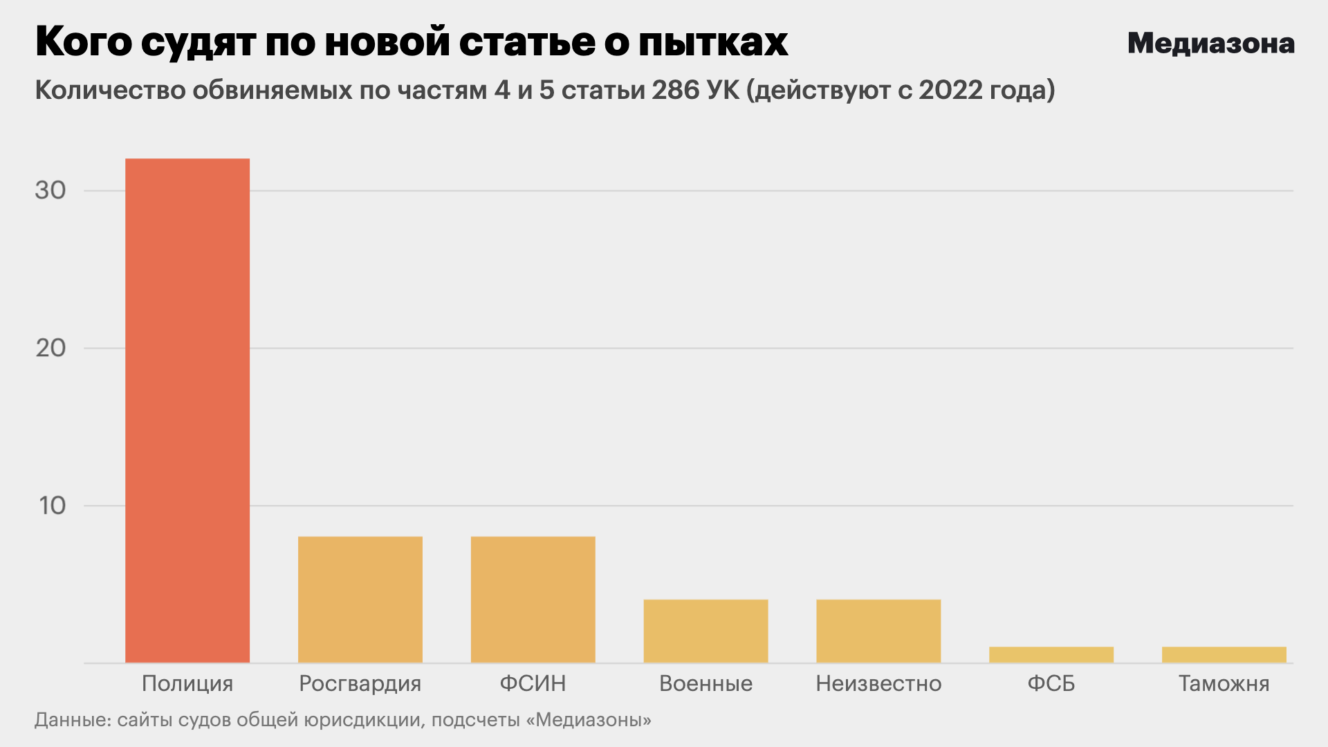 Первые дела по новому уголовному составу стали поступать в суды в конце 2022-го. На сайтах судов «Медиазона» обнаружила информацию о 32 делах о пытках: в это число входят и случаи, которые еще расследуются, и те, по которым уже вынесены приговоры или которые пока рассматривает суд. Приговоры уже вынесены по 11 делам.