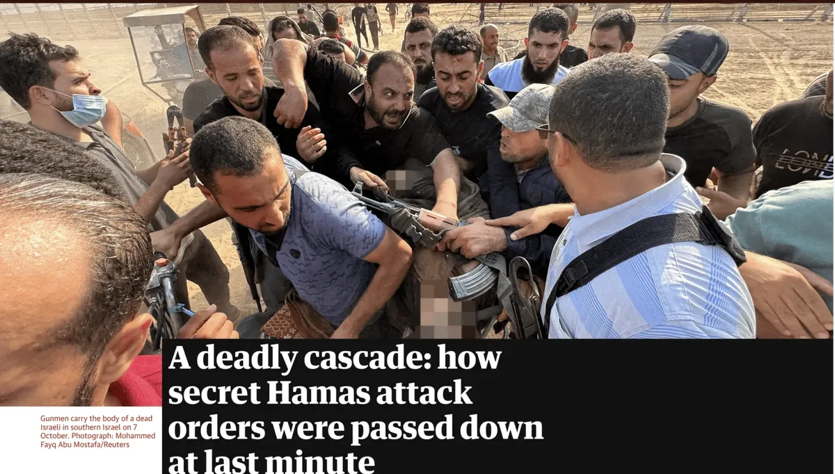 Некоторые из этих злодеяний были запечатлены находящимися в Газе фотожурналистами, работающими на информационные агентства Associated Press и Reuters, чье присутствие ранним утром в районе границы вызывает серьезные этические вопросы»,